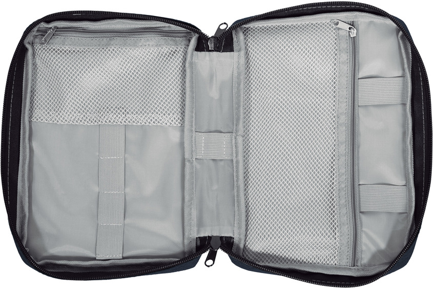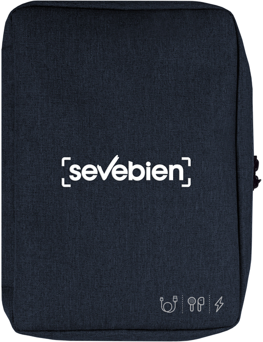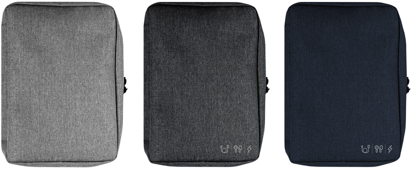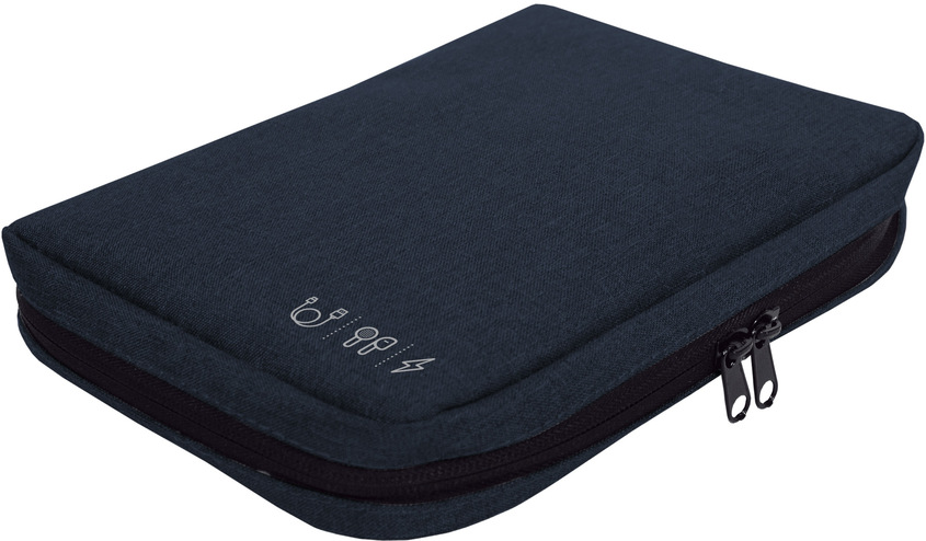 26 x 19 x 5 cm. Poliéster. Organizador para cables y accesorios. Cuenta con dos bolsillos de red con cierre. 4 elásticos que permiten arrollar y guardar los cables, 1 elástico porta bolígrafo y 2 elásticos amplios. NO INCLUYE ACCESORIOS.