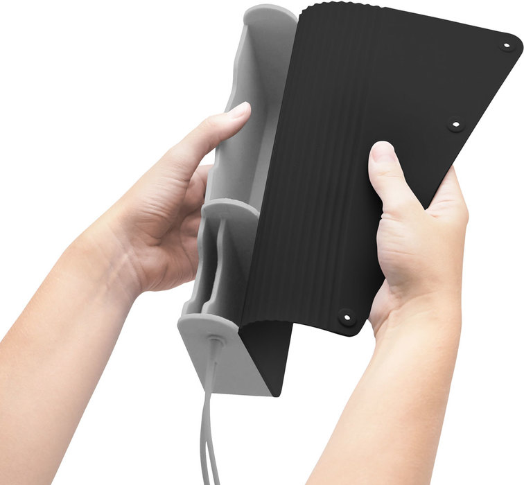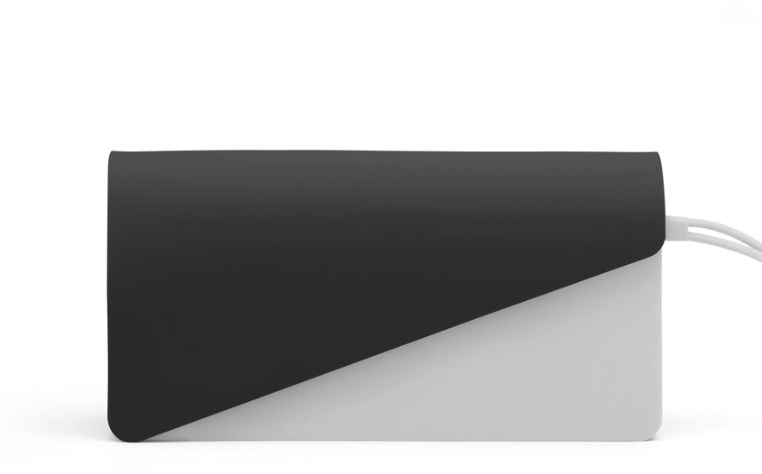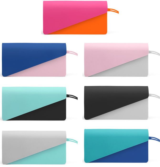 23,5 x 12 x 6,4 cm. Silicona. Sobre de silicona con solapa imantada y correa desmontable. Su interior tiene 3 compartimentos para guardar de todo. Presentación en caja de regalo.