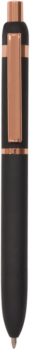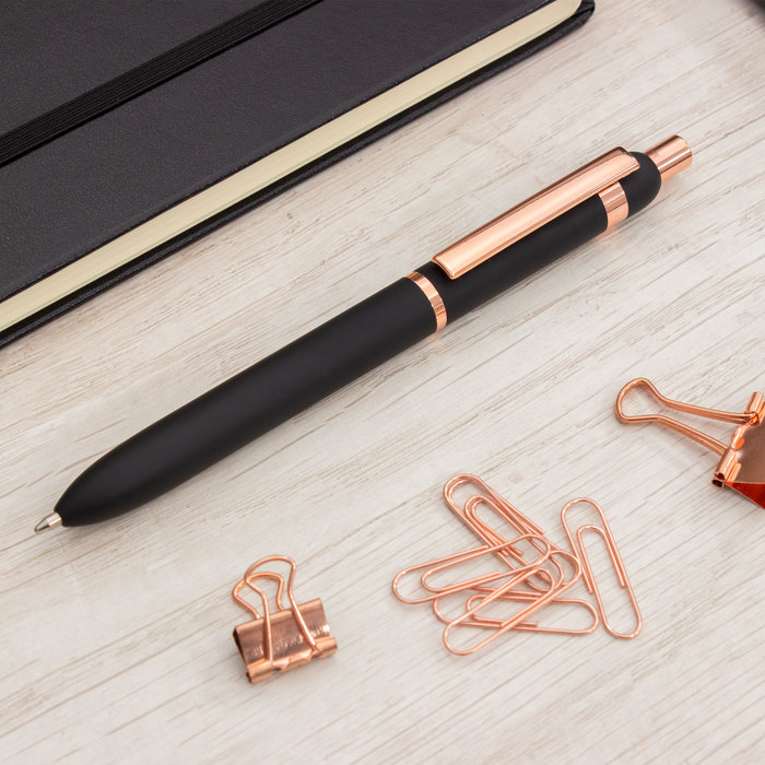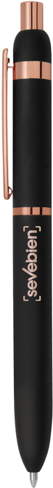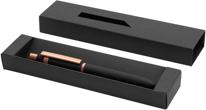 Metal. Cuerpo de aluminio, acabado engomado color negro, muy suave al tacto. Bolígrafo retráctil. Clip, botón y anillos metálicos color cobre. Tinta Azul. Decapa cobre tanto en el cuerpo como en la tapa. Presentación en caja de regalo.