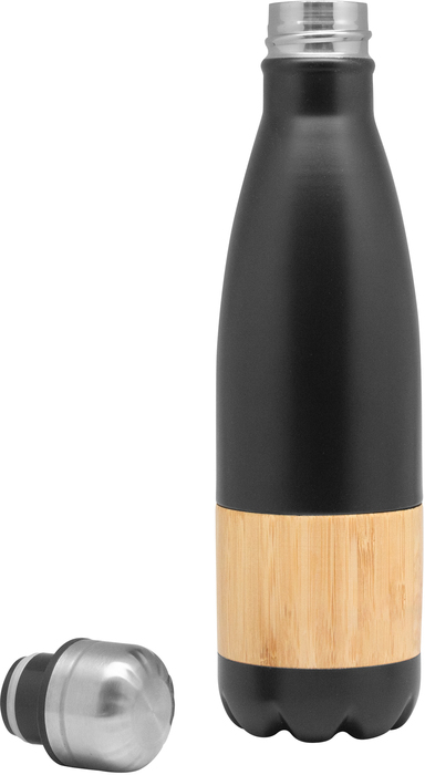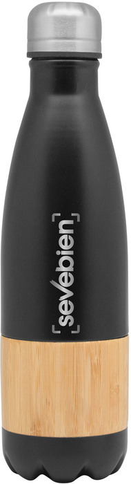 Ø7,4 x 26,8 cm. Capacidad 500 ml. Acero inoxidable. Botella doble pared, sellada al vacío. Interior en acero 304 y exterior en acero 201, con detalles de Bambú. Tapa de acero. Mantiene hasta 12 hs la temperatura de las bebidas calientes y 24 hs de las bebidas frías. Presentación en caja de regalo Kraft.