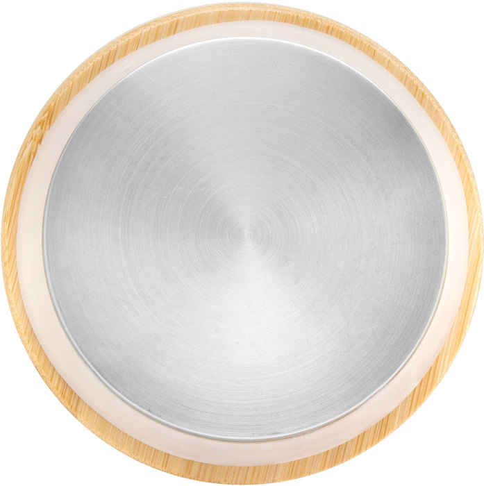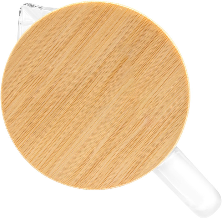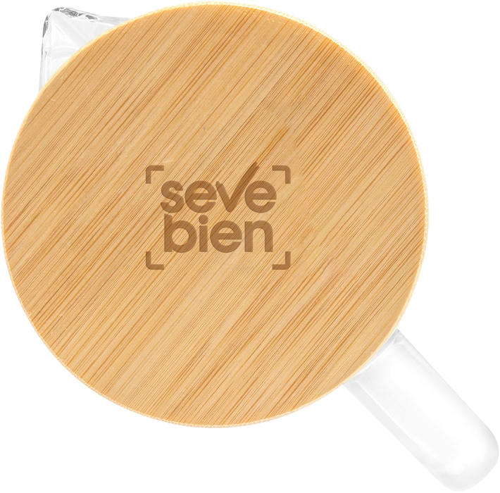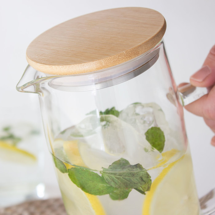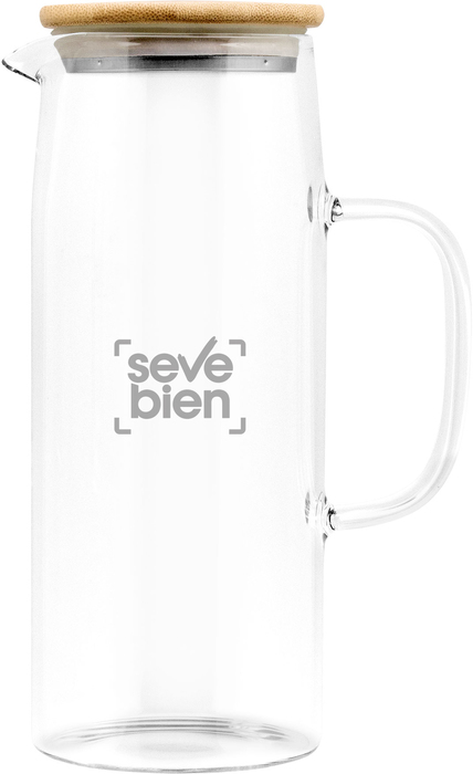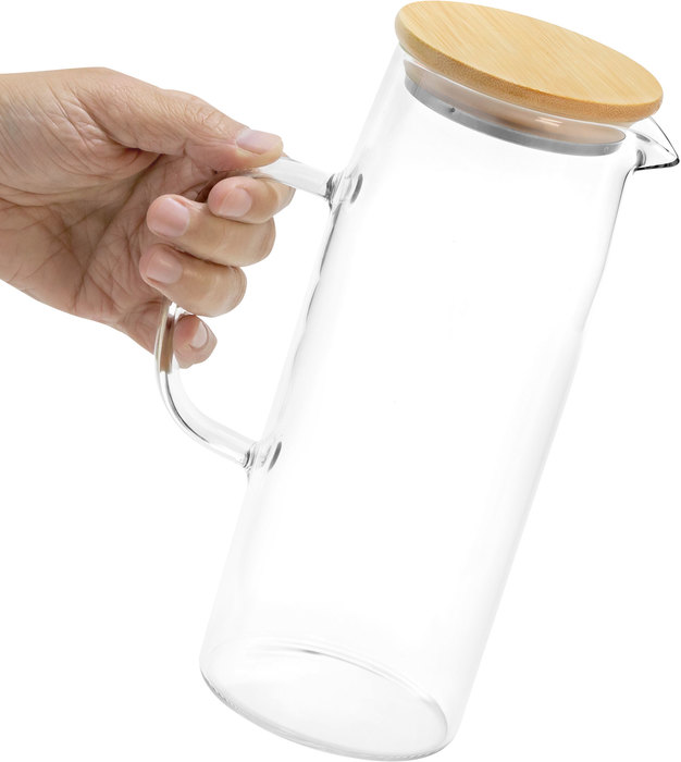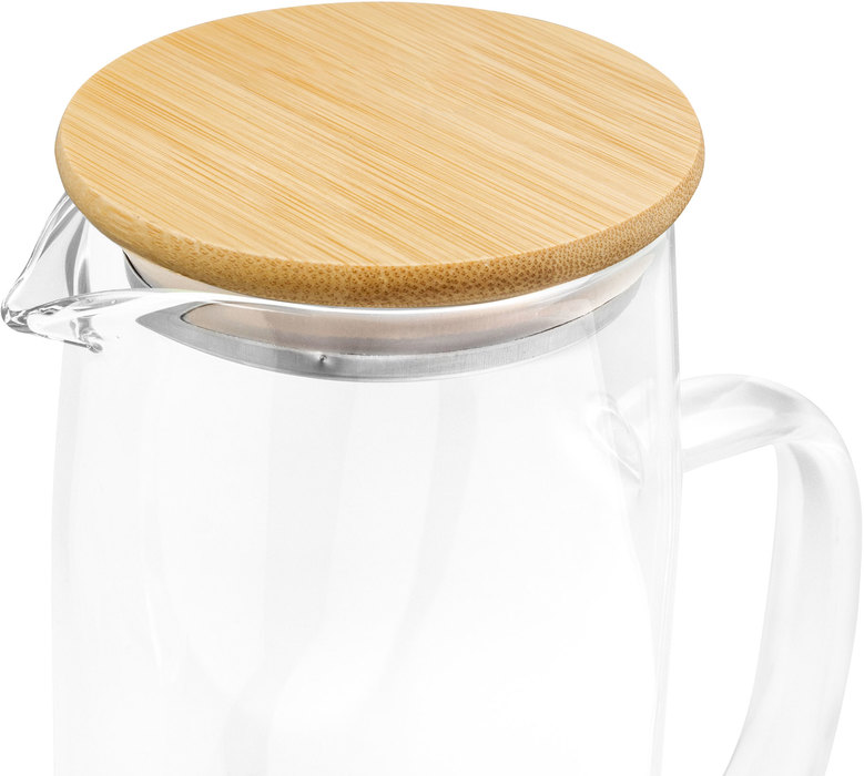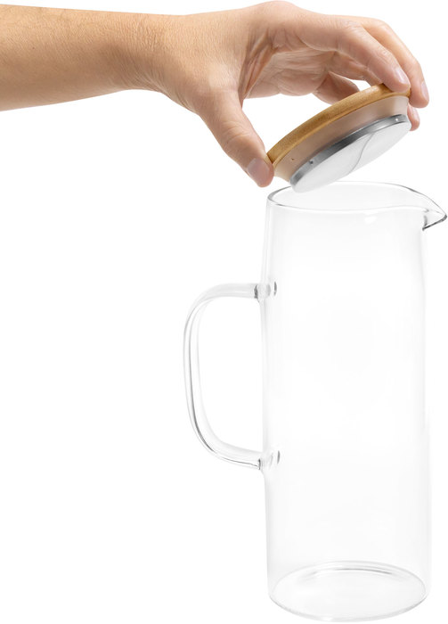 Ø 8,8 x 22,8 cm. Capacidad 1100 ml. Vidrio de borosilicato y bambú. Jarra con pico vertedor y asa de vidrio de borosilicato. Tapa de bambú y acero inoxidable 304 con anillo de silicona antiderrame. Presentación en caja de regalo kraft.
