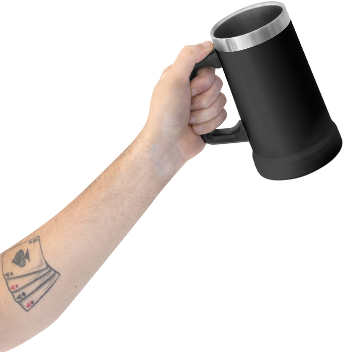 Ø 10 x 17cm. Capacidad 700 ml. Acero inoxidable. Jarro cervecero doble pared, sellado al vacío. Interior en acero 304 y exterior en acero 201. Mango Plástico. Pintura Powder coat (pintura más duradera y resistente a la corrosión y el paso del tiempo). Presentación en caja de regalo.