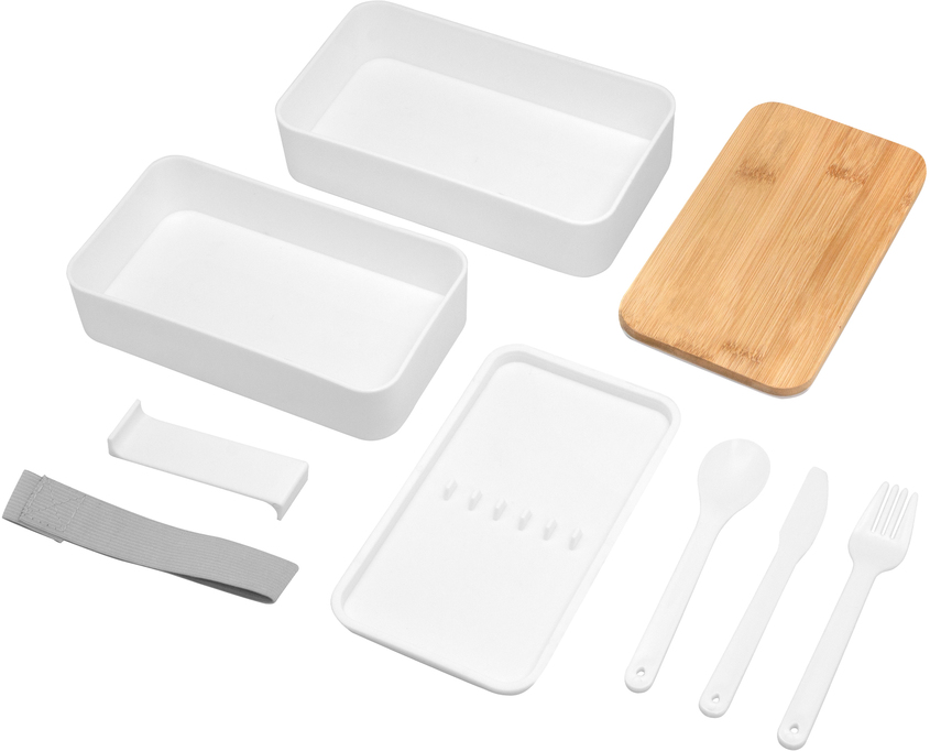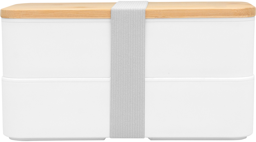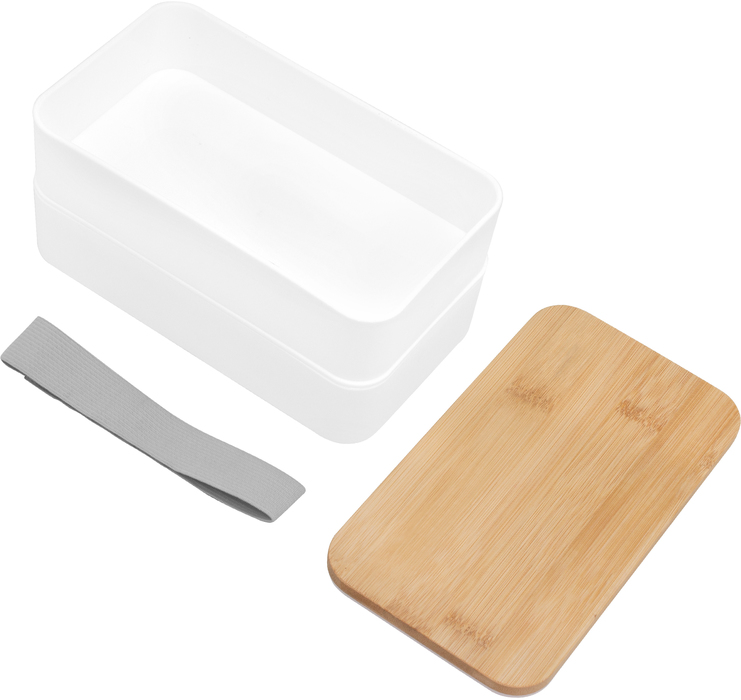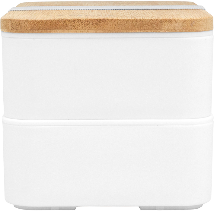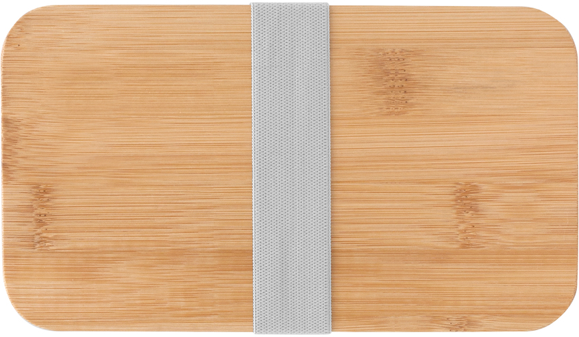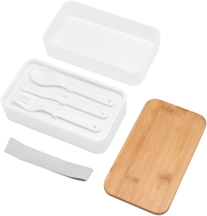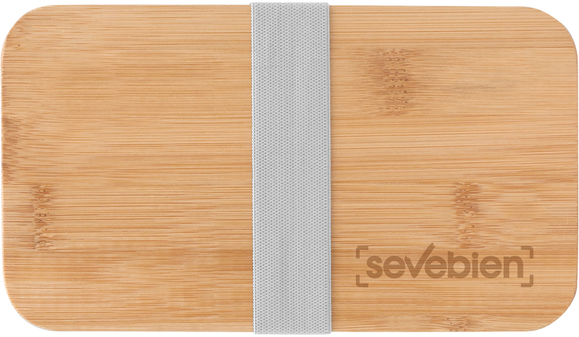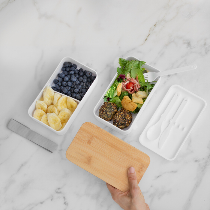 18.5 x 10.5 x 9.7 cm. Bambú + PP. Contenedor de alimentos con tapa de Bambú. Posee dos compartimentos plásticos, un separador y bandeja porta set de 3 cubiertos (cuchillo, tenedor, cuchara). La tapa de bambú debe presionar firmemente la bandeja donde se fija el juego de cubiertos. Cierre con sujeción elástica color gris. Producto apto para microondas (sin la tapa). Importante: solo se puede calentar la comida, NO sirve para cocinarla.