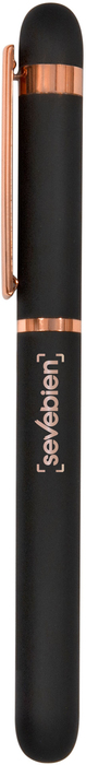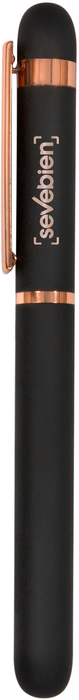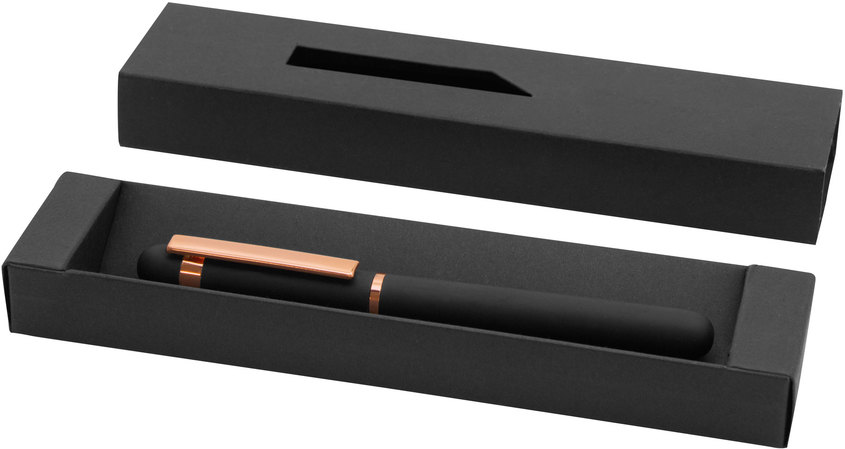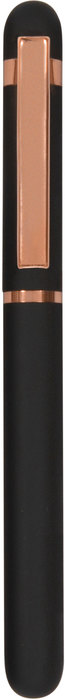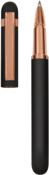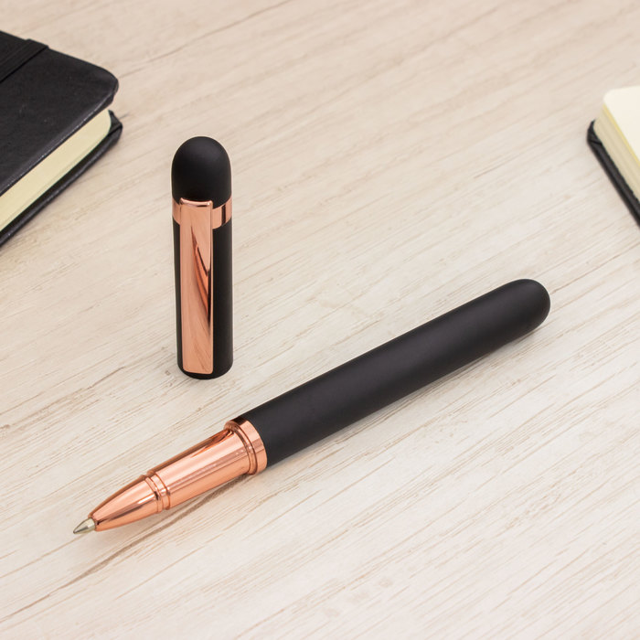 Metal. Cuerpo de aluminio, acabado engomado color negro, muy suave al tacto. Roller. Apertura con tapa a presión. Clip y anillos metálicos color cobre. Tinta Azul. Decapa cobre tanto en el cuerpo como en la tapa. Presentación en caja de regalo.