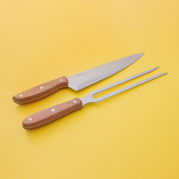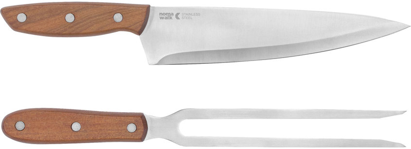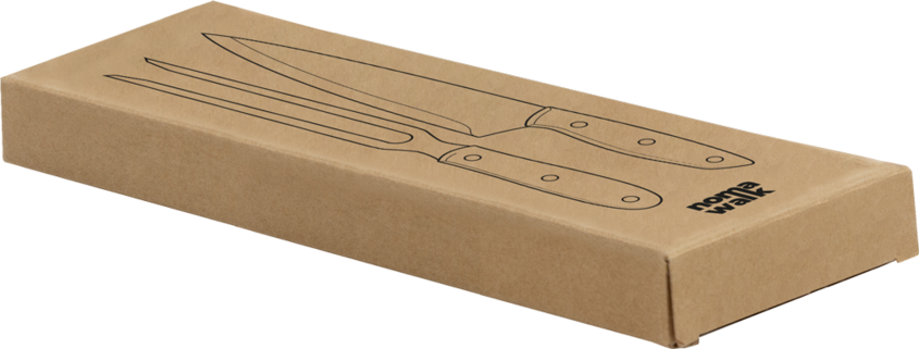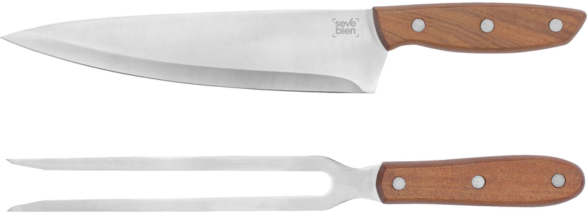 34 x 9,7 x 2,5 cm (caja) . Acero inoxidable 420. Set de 2 utensilios: tenedor y cuchillo de 31,4 cm, ambos con mango de madera. Presentación en caja de regalo Kraft.