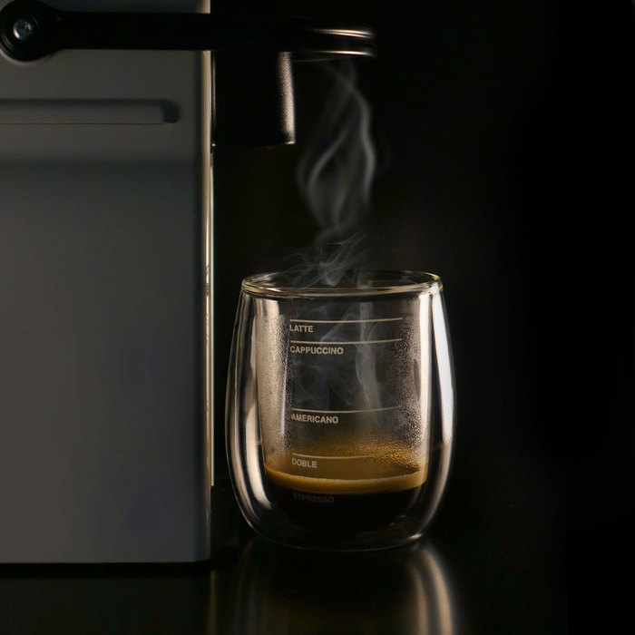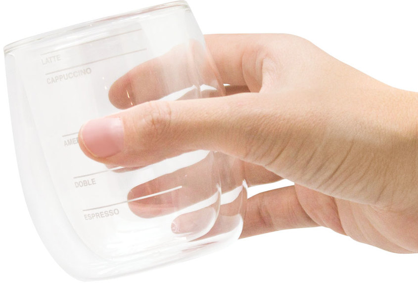 Ø 7 x 9 cm. Capacidad 200ml. Vidrio de Borosilicato. Set de dos vasos doble pared con cinco marcas de medidas de cafe para probar y elegir el tipo de café ideal para cada momento. La caja incluye las proporciones para una correcta preparación. Presentación en caja de regalo.