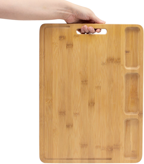43 x 32 x 1.8 cm. Tabla de corte en Bambú. Tres compartimentos para armar botanas y llevarlas directo a la mesa. Transportable con manija incluida. Presentación en caja de regalo.