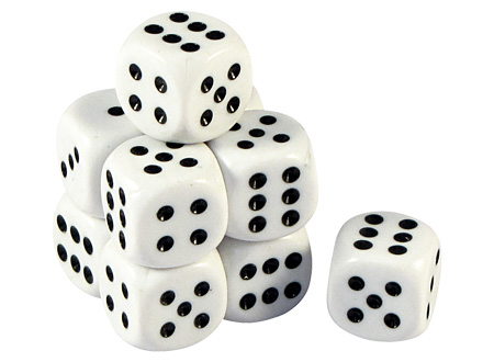Dado de juego, extra-blanco, con puntos negros. Presentación en paquetes de 10 unidades. El valor publicado es unitario, no por bolsa.