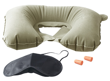 Kit de Descanso para Viajes. Incluye Almohada inflable cervical en tela aterciopelada, antifaz de microfibra y tapones de EVA para los oídos. Presentación en estuche aterciopelado.