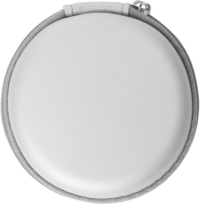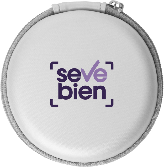 Auriculares bluetooth. Cable de 57,5 cm aprox. Plástico. Sujeción deportiva que asegura una buena fijación del audífono. Botones para aumentar, disminuir el volumen, aceptar y rechazar una llamada. En uno de los costados entrada mini usb para poder cargar. Estuche redondo de Eva Pouch.
