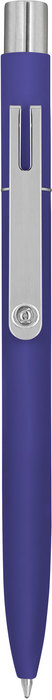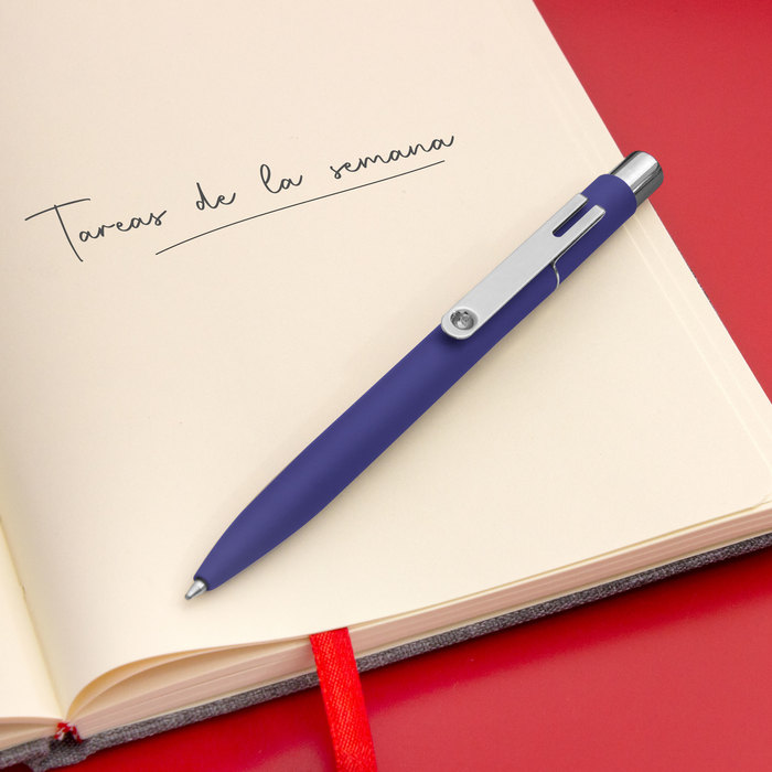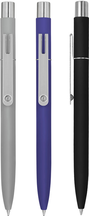 Metal. Cuerpo de aluminio, acabado engomado en diferentes colores, muy suave al tacto. Bolígrafo retráctil. Clip, pulsador y anillo metálicos color plata. Tinta negra. Destape al grabar color plata.