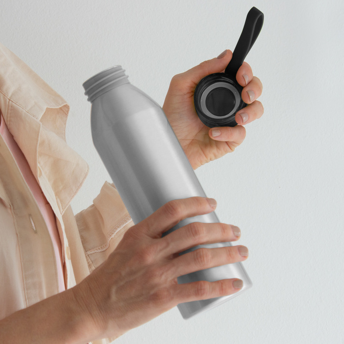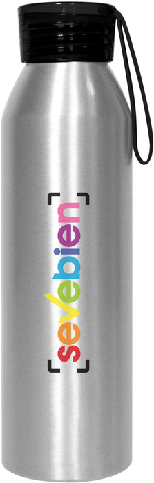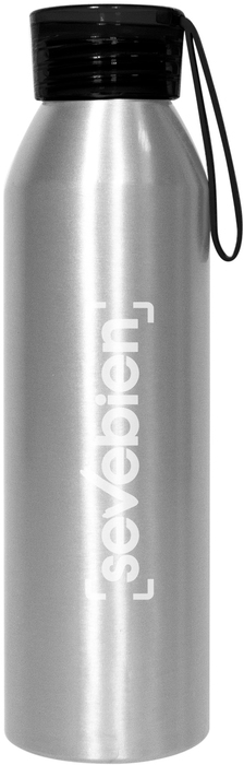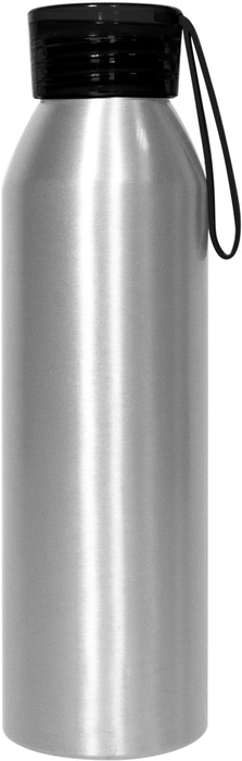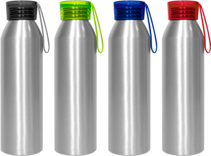 Ø 6,6 x 23 cm. Capacidad 600 ml. Aluminio. Cuerpo color plata, tapa de color traslucida con tira de silicona (de 8 cm) del mismo color. Ideal para hiodratarte todos los días. Presentación en caja de regalo.