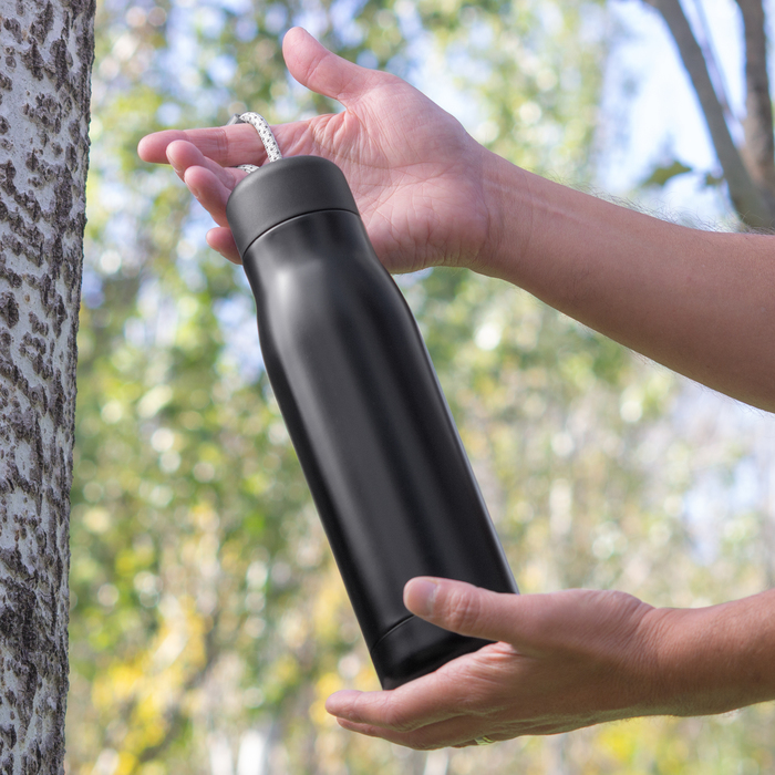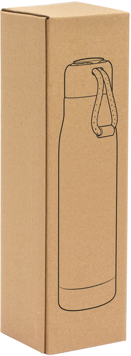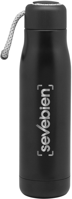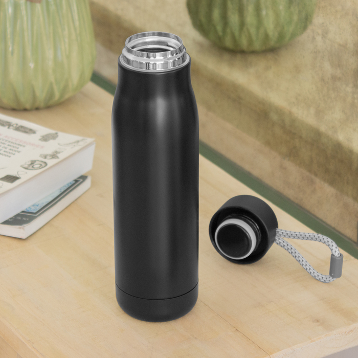 Ø 7cm x 25.5 cm. Capacidad 500 ml. Acero inoxidable. Botella doble pared, sellada al vacío. Interior de acero 304 y exterior de acero 201. Tapa plástica PP + Anillo de silicona antigoteo. Posee además tira de color gris de 12 cm de largo. Ideal para llevarla a todos lados. Mantiene hasta 12 hs la temperatura de las bebidas calientes y 24 hs de las bebidas frías. Presentación en caja de regalo Kraft.