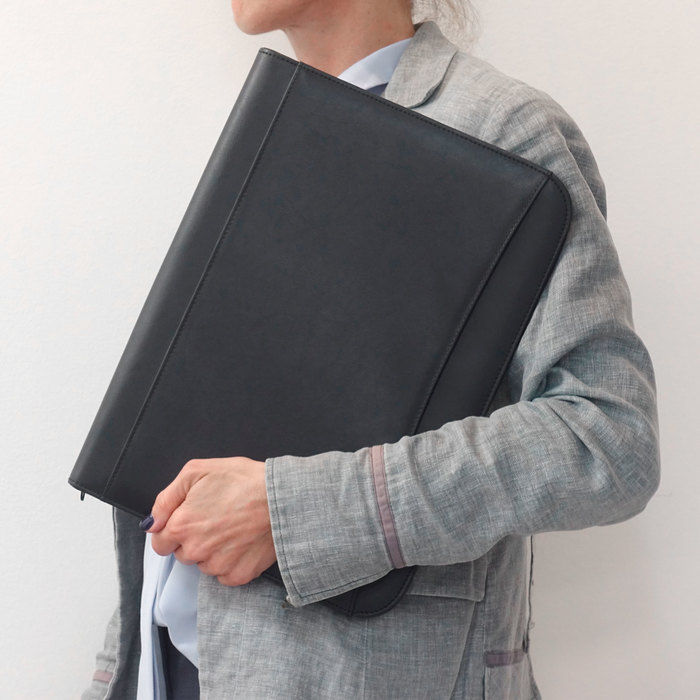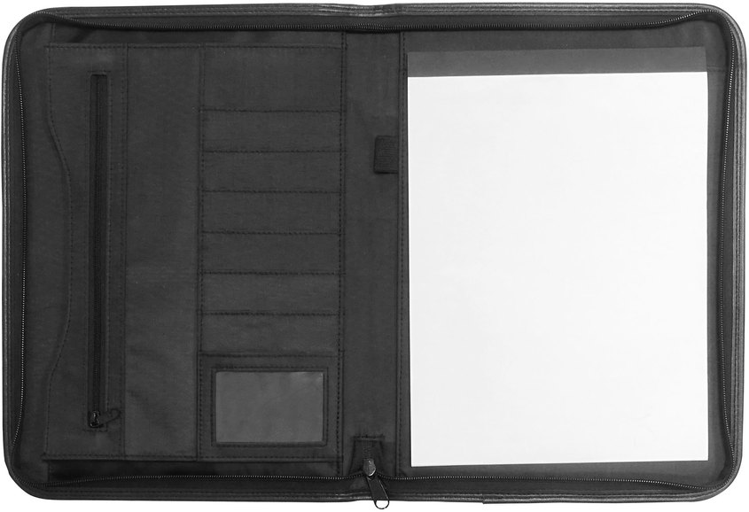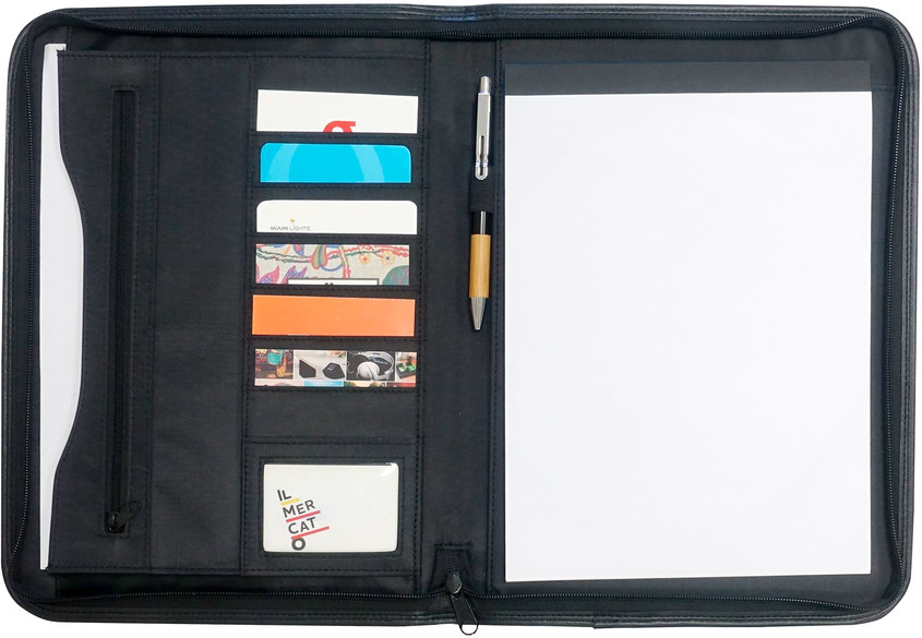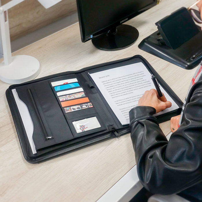 26 x 35 x 3 cm. PU. Carpeta con cierre. Contiene 1 bloc de 20 hojas lisas tamaño A4. Porta bolígrafo. Bolsillo externo. Compartimentos internos para 7 tarjetas. Sobre con fuelle y bolsillo interno con cierre. Diseñada con materiales que poseen algunos beneficios ambientales sobre el cuero genuino, ya que no requiere de animales para su fabricación y además, no necesita ser químicamente curtido.