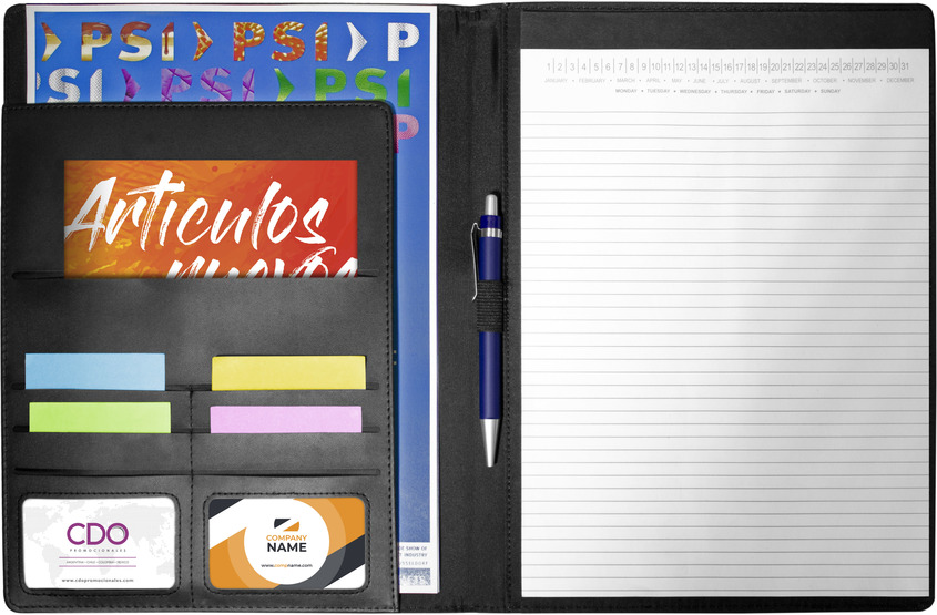 24 x 31 (cerrado). 48 x 31 (abierto). Lino 150D. Placa metálica para grabado (Medida: 5x2cm). Interior plástico. Con porta tarjetas y porta Bolígrafos elásticos. Bloc tamaño A-4 con 20 hojas blancas.