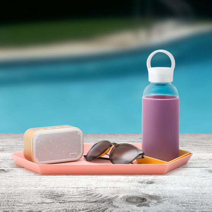 2 módulos de 19 x 11 cm, 1 módulo de 29 x 22 cm y 1 módulo de 33 x 19 cm. Plástico. Organizador de escritorio con 4 bandejas modulables de distintos tamaños y colores.