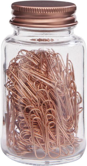 Ø 4,5 x 8,5 cm. Vidrio y metal. Set de clips metálicos en frasco de vidrio con tapa metálica.