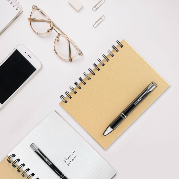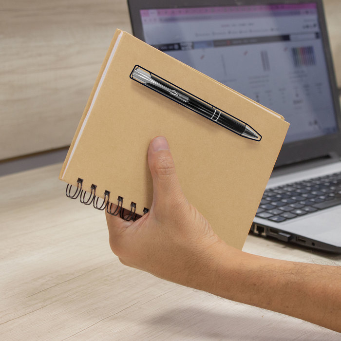 13 x 18 cm. Libreta color Kraft, anillado metálico y 70 hojas punteadas de 70g. Bolígrafo metálico (BP295) color negro con tinta negra. Mediante sistema de imanes el bolígrafo queda sujetado a la tapa, causando un efecto sorprendente.