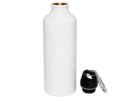 Botella blanca de Aluminio de 500cc. con cobertura para Sublimación. Incluye tapa rosca plástica y mosquetón metálico plateado.