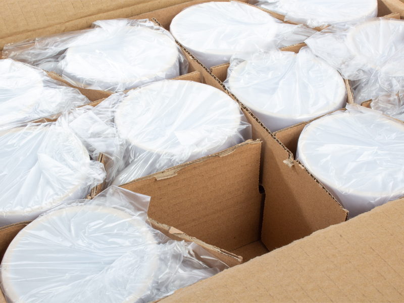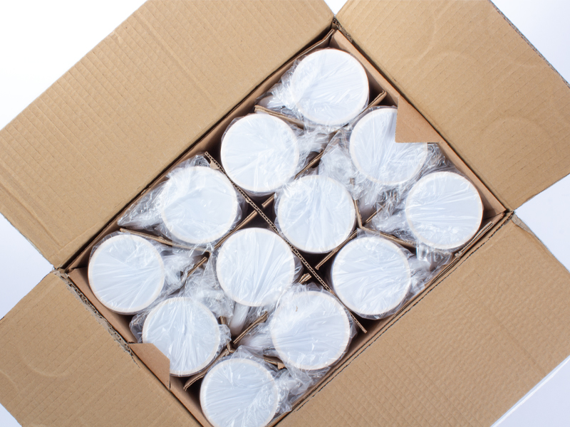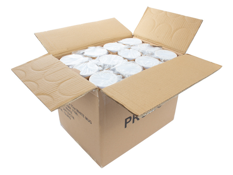 Cartón con 36 tazones cerámicos extra-blancos para sublimación. Presentación unitaria en bolsa plástica transparente, con separadores de cartón dentro de la caja (no incluye caja individual).