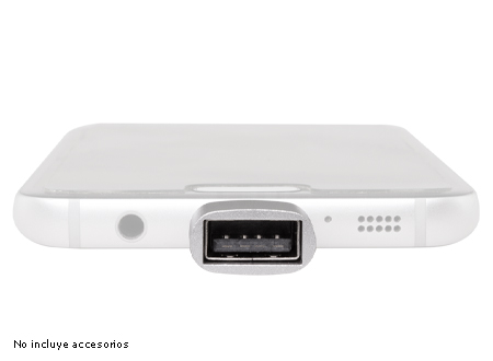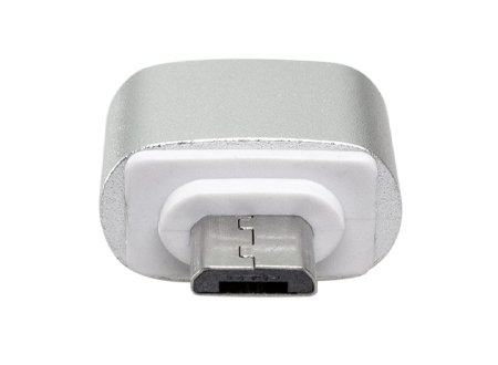 Adaptador USB-Micro USB (OTG-B), con cuerpo metálico plateado.