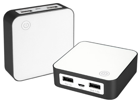 Power Bank cargador USB de plástico ABS con borde metálico. Capacidad 8400mAh. Incluye cable USB + 4 adaptadores para iPhone 4, 5 y 6, Samsung Galaxy, Mini-USB, etc. Batería recargable incorporada. Presentación en caja blanca de regalo.