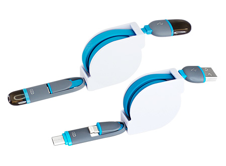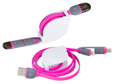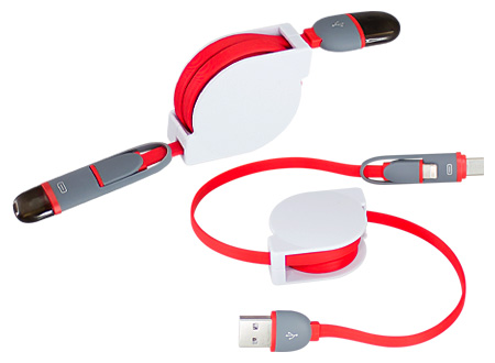 Connect Multicargador Retráctil, con cable de 1m de plástico engomado TPE de color, terminales de carga USB y Micro USB / i-phone / Type C. Incorpora nueva tecnología de cable cargador dual Micro USB y i-phone (en el mismo terminal). Compatible con dispositivos Android, Apple y Type C. Soporte plástico ABS blanco con amplia área de impresión. Presentación en elegante bolsa OPP con orificio para ganchera. Producto con aprobación CE, ROHS, FC.