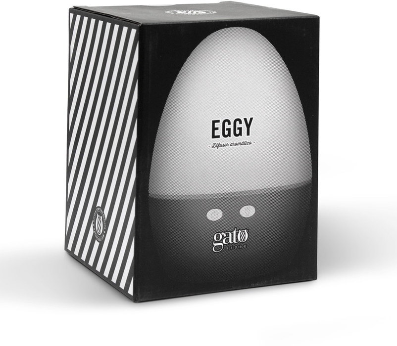 Ø 10,5 x 15 cm. Plástico + Polipropileno. Luz cálida (2 intensidades) y modo fade continuo entre luz tenue y luz fuerte. Difusor de aroma. Eggy tiene una luz tenue y emite un fresco vapor con el aroma de tu esencia favorita. Un placer para los sentidos. Presentación en caja de regalo.
