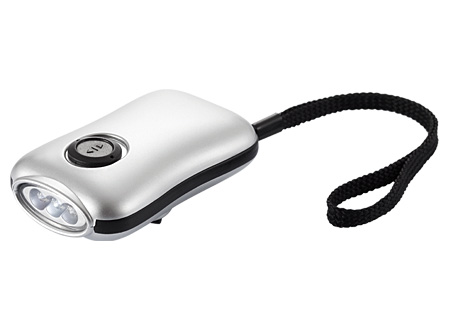 Linterna 3 LED con dínamo de manivela. Con huincha para colgar. FICHA DEL PRODUCTO Tamaño: 8.5 x 5 x 3 cm. Colores: Plata (00).