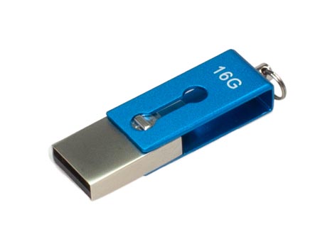 Mini-Pendrive 2.0 dual OTG-ANDROID con 16GB de memoria, con cuerpo y carcasa metálica de giro. Con sistema OTG dual, terminales USB y Micro USB, para conectar directamente al computador o al teléfono celular Android. Presentación en práctico blister de cartón reciclado con ranura para ganchera, y estuche plástico translúcido para remover el pendrive directamente.