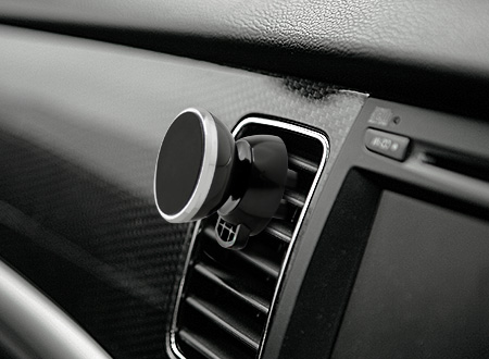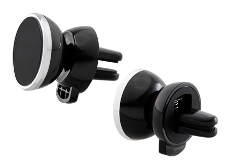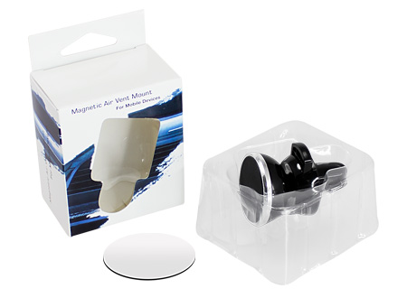 Porta-Celular magnético, con soporte para rejilla de ventilador del vehículo. Contiene placa redonda metálica con adhesivo posterior, para pegar a los celulares (más antiguos) que no cuentan con material magnético built-in. Esta placa redonda se puede grabar, previamente a ser pegada en el celular.