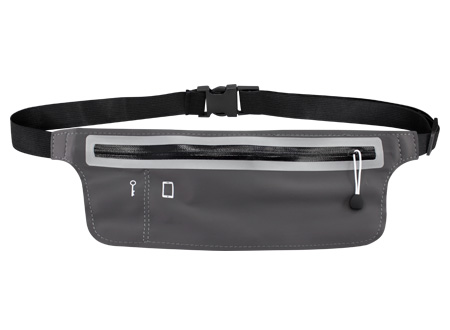 Banano impermeable, en tela Polyester Stretch 210 Waterproof. Incluye banda-cinturón elasticado ajustable color negro, bandas reflectantes color plateado, cierre-eclair impermeable y doble compartimento, uno para smart-phone, otro para accesorios como llaves o monedas.