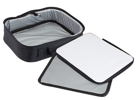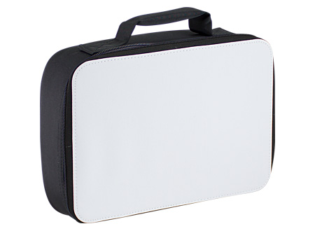 Lonchera de Microfibra, con interior cooler con aislante térmico plateado. Incluye mango y tapa dura en tela blanca para Sublimación a todo color. Cierre eclair.