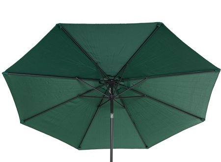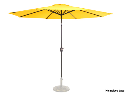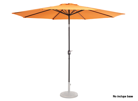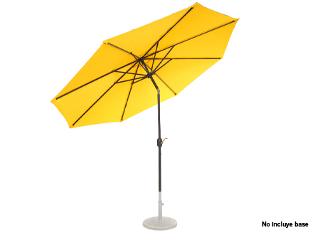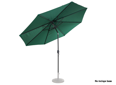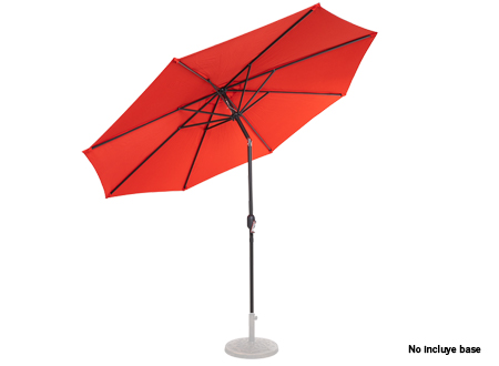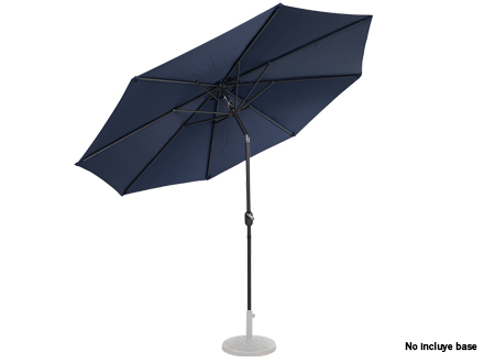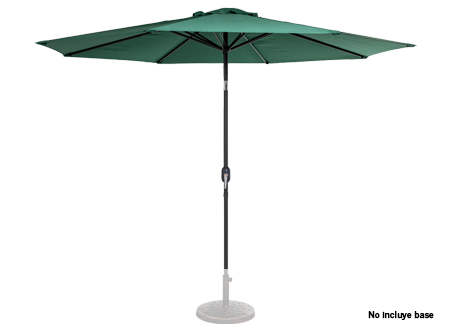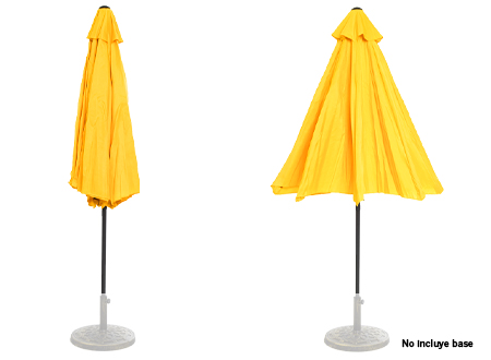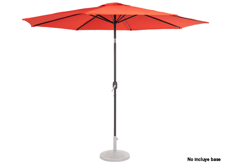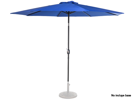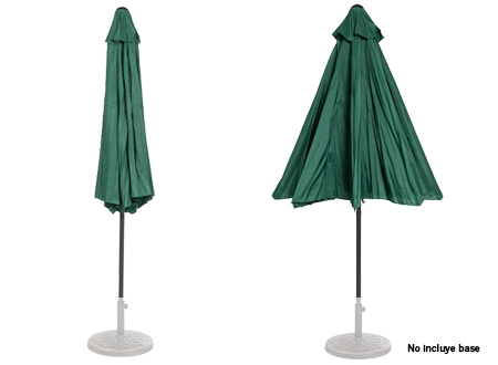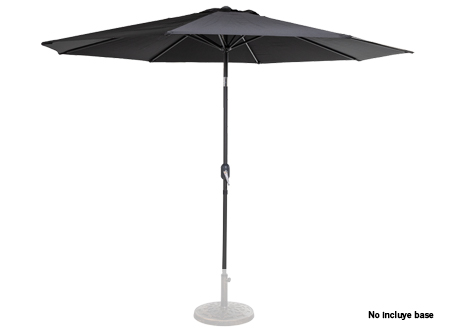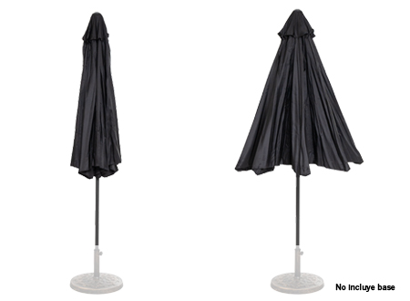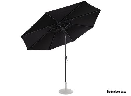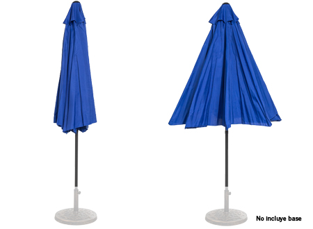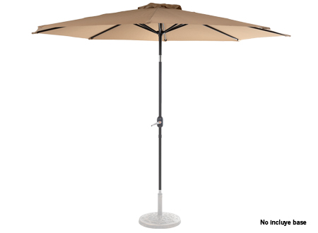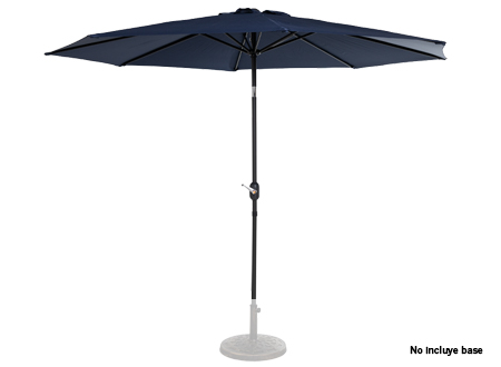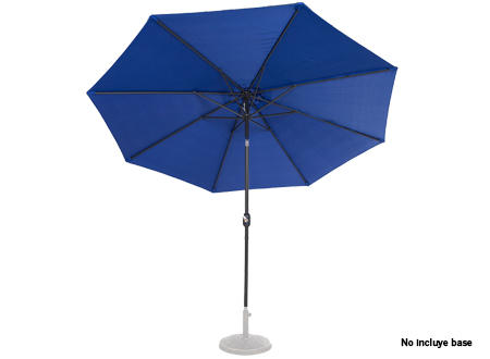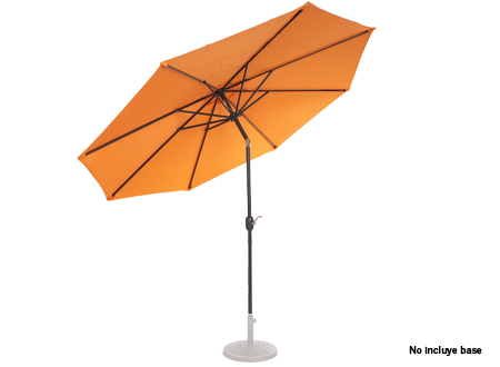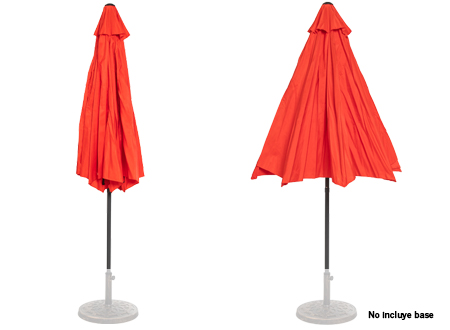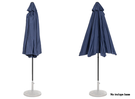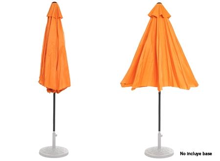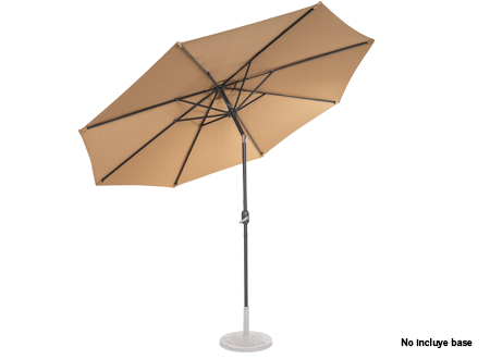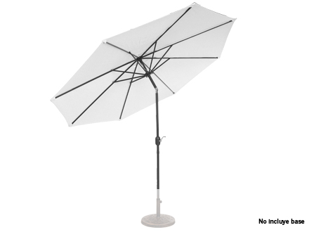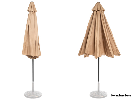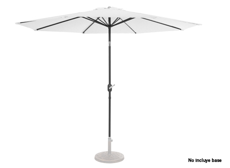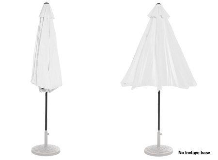 Quitasol redondo de Ø3m, modelo "Shake", con 8 cascos de lona Poliéster UV impermeable de 160g. Contiene varas reforzadas de Acero recubierto de 12 x 18mm, asta de Acero recubierto de 38mm, sistema de apertura automático con manivela y codo giratorio de 45°. No incluye base.