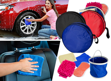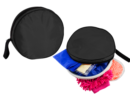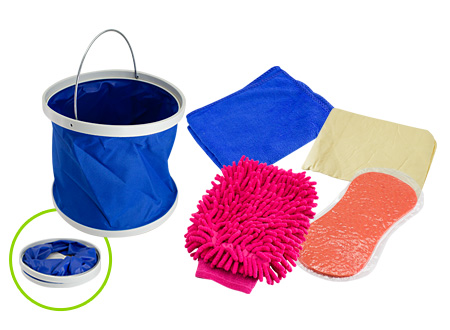 Set de Lavado de Automóvil en Estuche redondo de tela poliéster. Contiene 5 accesorios: balde plegable azul de D23.6 x 22.4 cm, toalla de microfibra azul de 67 x 28 cm, paño limpia-vidrios amarillo de 42 x 31 cm, esponja expandible naranja de 22 x 11 x 4 cm, guante de lavado fucsia de 19 x 21 cm.