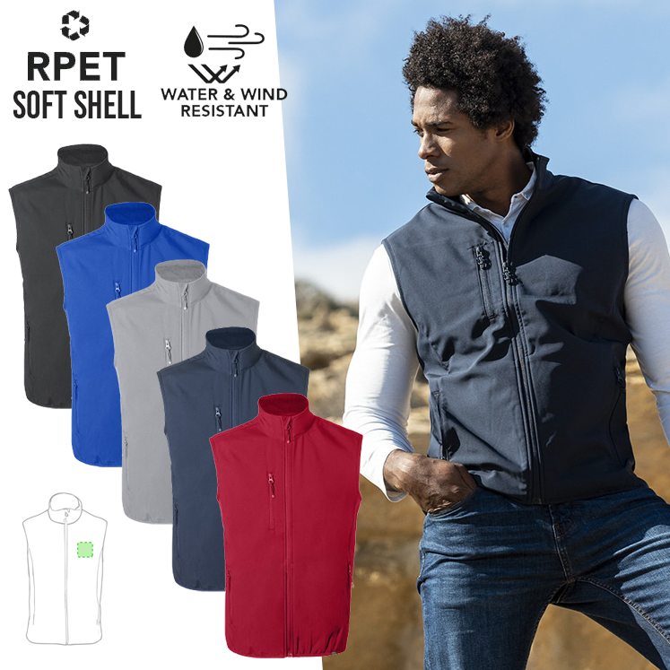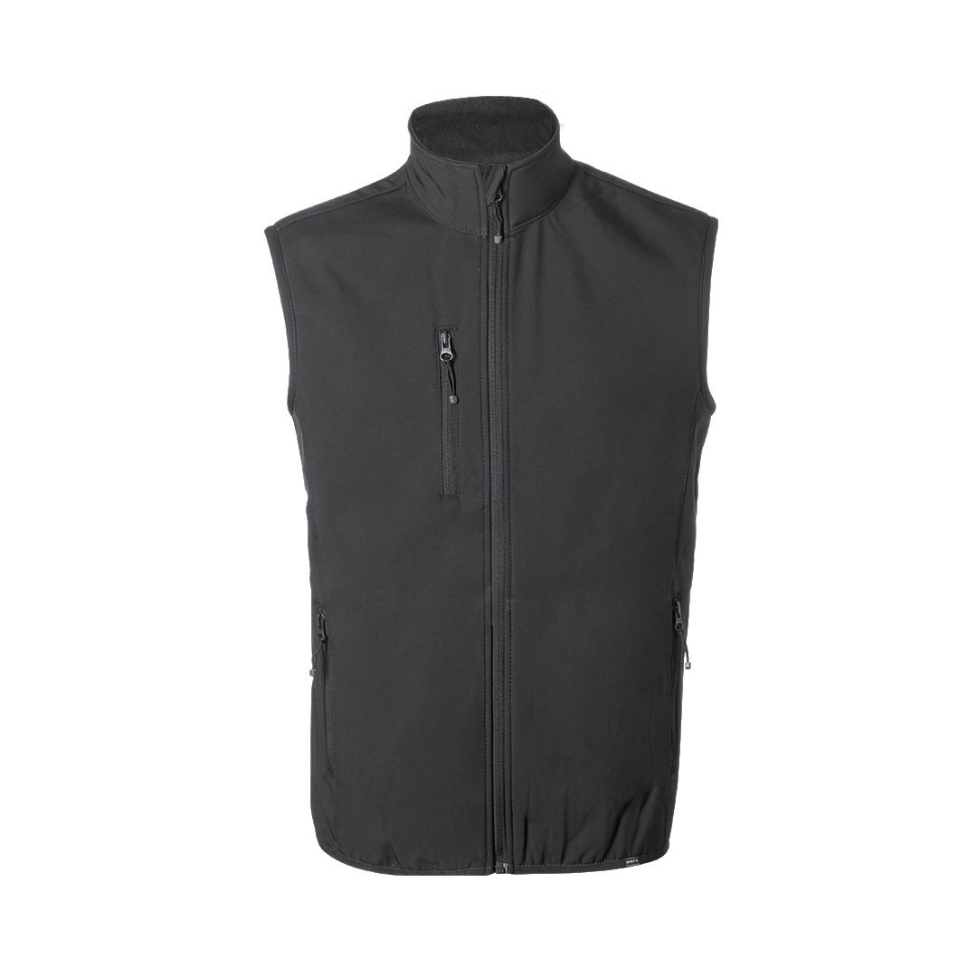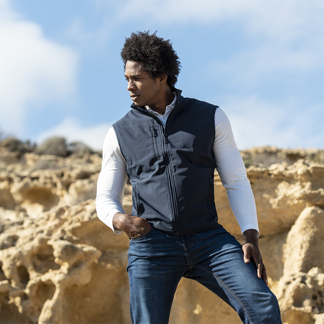 Composición: Exterior: Soft Shell, 92% Poliéster RPET/ 8% Elastano. Interior: 100% Poliéster Microfleece RPET. 300 g/ m2