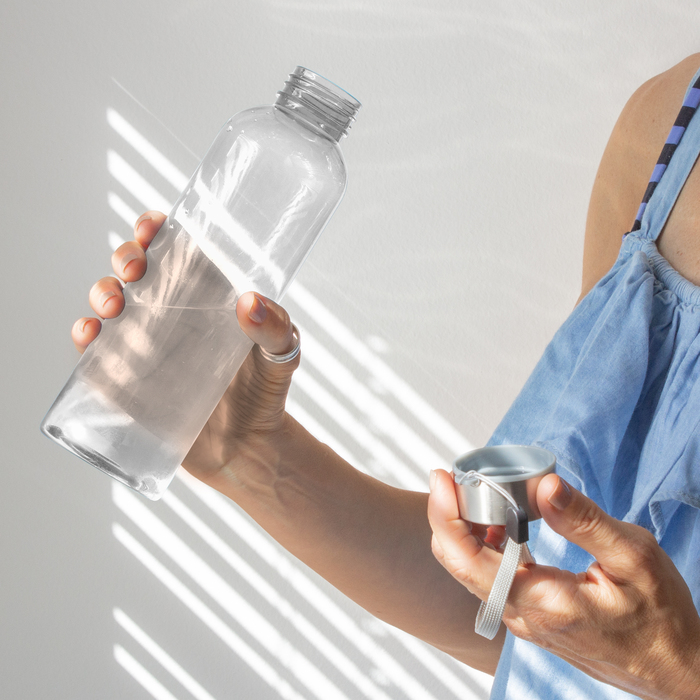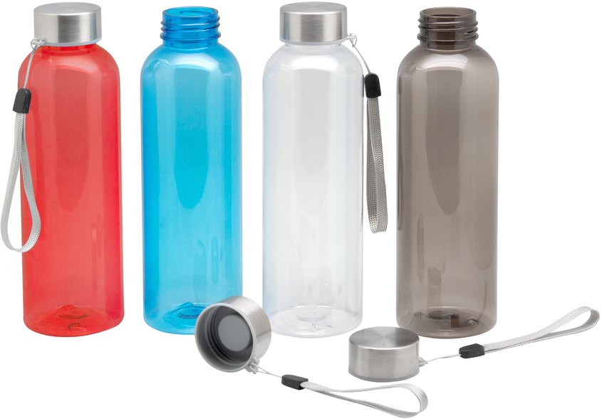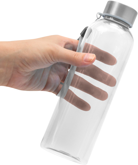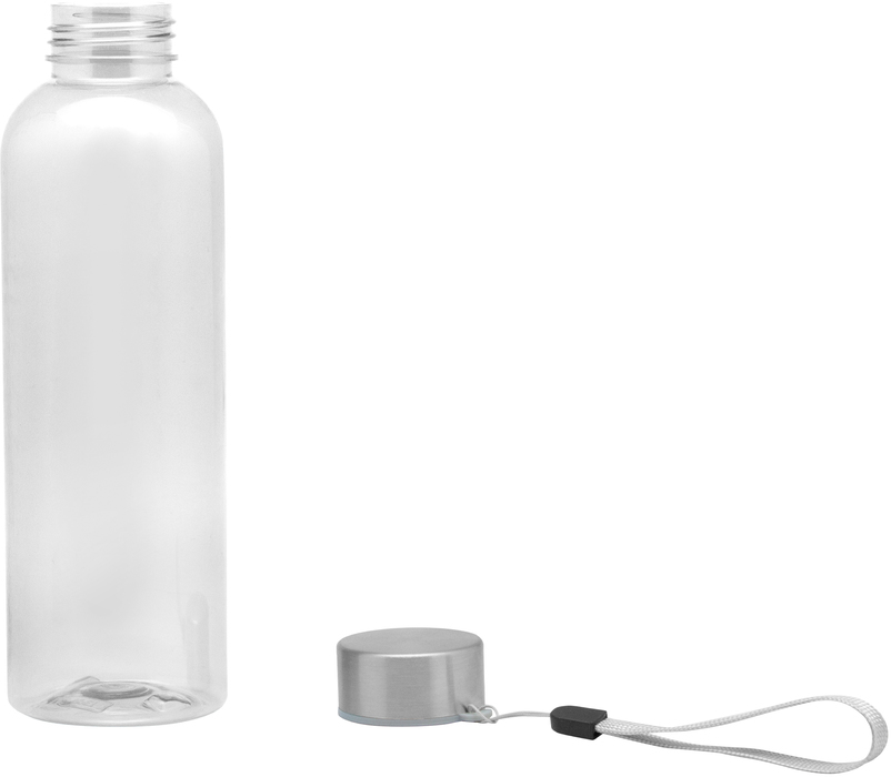 Ø 6,5 x 21 cm. Capacidad 550 ml. Material PET . Botella con tapa de acero inoxidable y correa para transportar.