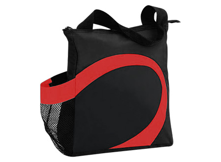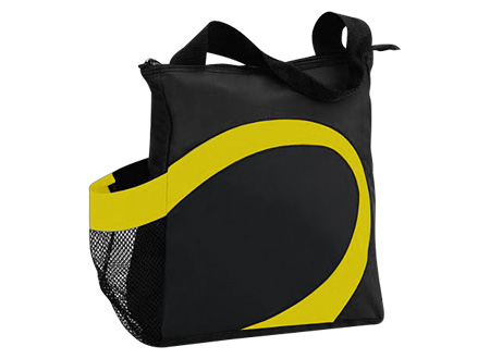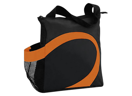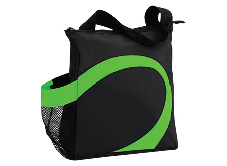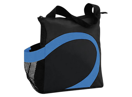Cooler modelo "Wave". Tela exterior Polyester 70D/PVC. Tela interior plateada aislante 15C PEVA + relleno 3mm esponja PE. Cierre cremallera superior. Incluye bolsillo lateral en tela malla.