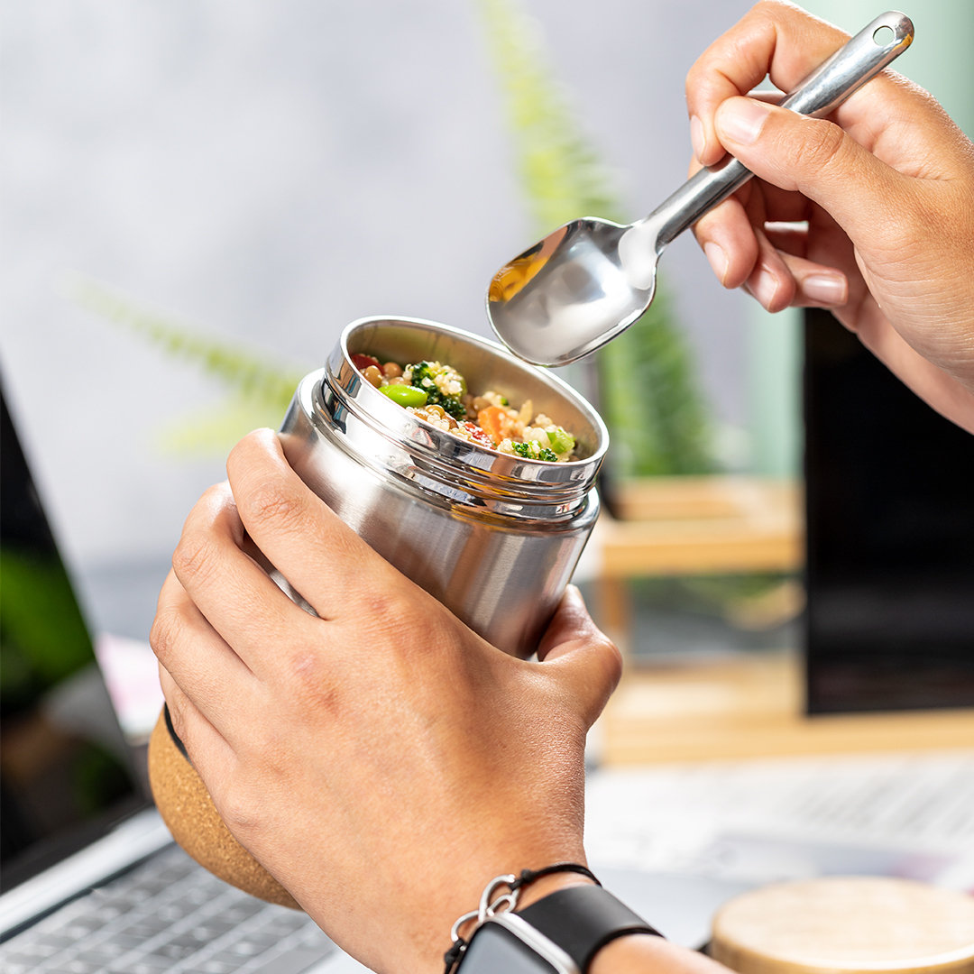 CARACTERÍSTICAS Composición: Acero Inox/ Bambú/ Corcho Natural Especificaciones artículo: cm / cm / cm | gr Packaging: alto (cm): 42 Packaging: largo (cm) : 52 Packaging: ancho (cm) : 22 Peso caja (Kgr): 8 Unidades/caja: 20