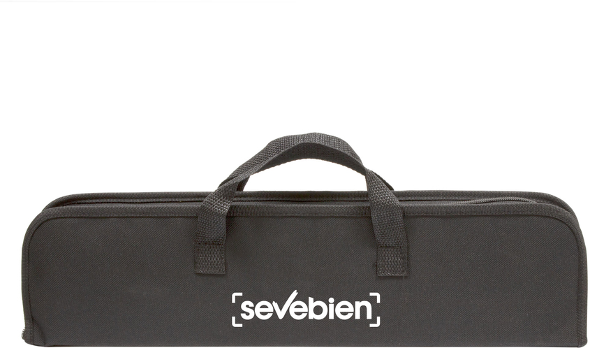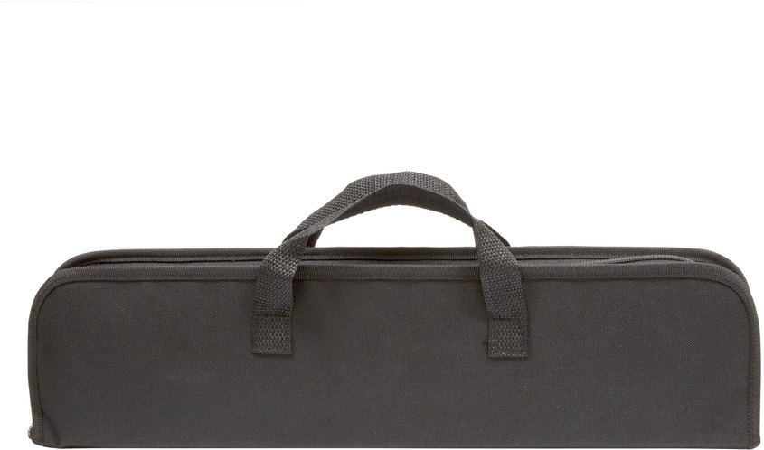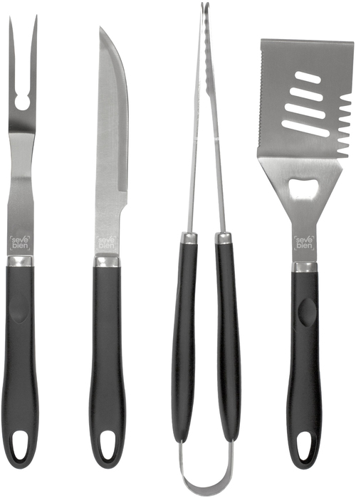 48 x 12,2 x 5,5 cm (estuche cerrado). Acero inoxidable 420. Set de 4 utensilios: tenedor y cuchillo de 41 cm, pinza de 44,5 cm y espátula de 40 cm de largo, todos con mango plástico en color negro. Estuche de nylon 600 D color negro con cierre. Calidad Premium.