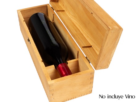 Caja de Madera natural de Teca, para botella de vino. Con broche color bronce envejecido.