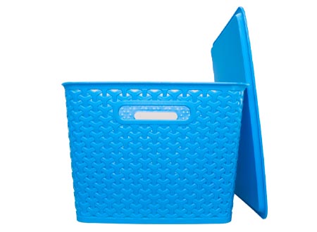 Canasto plástico organizador de 36.5 x 30 x 22 cm con tapa plástica. Diseño entrelazado tipo ratán. Capacidad 24 lt. FICHA DEL PRODUCTO Tamaño: 36.5 x 30 x 22 cm Capacidad: 24 lt Colores: Azul (02) Material: Plástico ABS