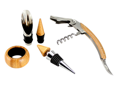 Deluxe Set de 4 accesorios para el vino, en caja 100% madera Bamboo, con cierre mosquetón envejecido. FICHA DEL PRODUCTO Tamaño: 23 x 13 x 4.8 cm. Colores: Madera (12).