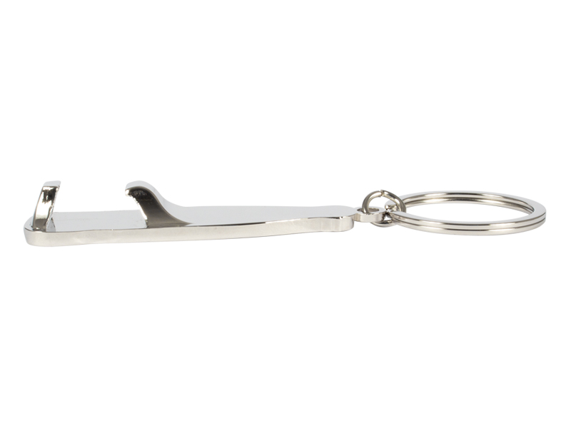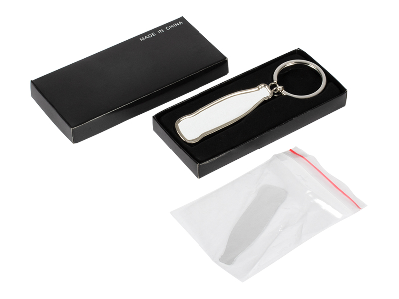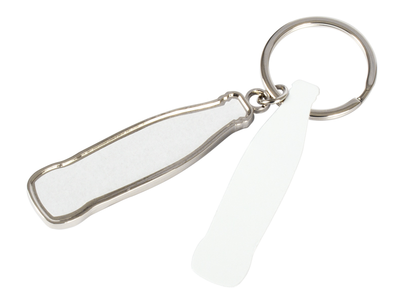 Llavero-destapador metálico con forma de botella de bebida gaseosa, para Sublimación. Incluye argolla llavero de Acero inoxidable. Presentación en estuche negro con cama aterciopelada negra.