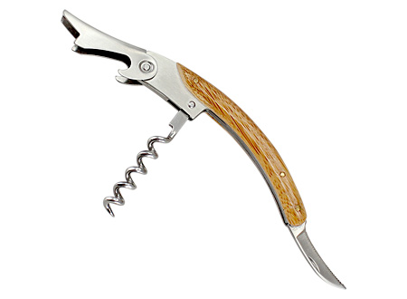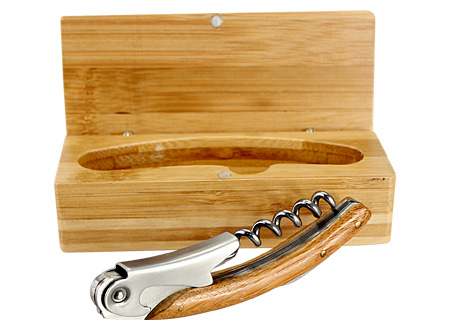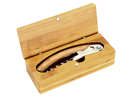 Multiherramientas para el vino, en caja sólida 100% madera Bamboo, con cierre mosquetón envejecido. Incluye descorchador, destapador y abre-sellos.